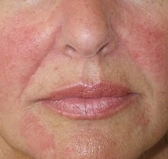 Udbredt rødme – især på kinder og næse (hage og pande kan også være angrebet). Rosacea er en kronisk betændelse/inflammation i huden. Huden kan føles sart og brændende ligesom der kan være forstørrede talgkirtler og bumser/papler.
